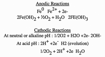 Corrosion in these applications follow the classical corrosion cell model. The cell is set up when a potential exists between two metals or two different sites on the same metal. This promotes current flow in the presence of an electrolyte. Corrosion occurs at the anode as the electrons are lost, i.e., the metal is oxidized. Electrons flow through the metal and exit at the cathode. The anodic and cathodic reactions follow: