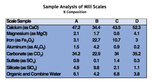 The control of general scale formation is critical in once-through cooling loops in order to ensure the efficient operation of associated heat transfer equipment and also to minimize under-deposit corrosion. Scales typically found in these systems contain mainly calcium carbonate and iron corrosion byproducts. Silt and organic microbiological matter can also be present to a lesser extent. The table below depicts analytical results of typical deposits found in once through applications.